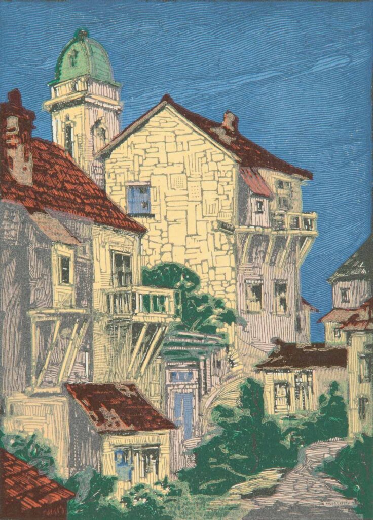 Fred T. Larson was born in Chicago, Illinois in 1868 to Norwegian immigrant parents. After attending the Art Institute of Chicago, he apprenticed as a lithographer but instead took up the art of wood engraving. Larson became a successful painter and printmaker known for his woodcuts, block printing, and landscapes. He was also one of the founding members of the Palette & Chisel Academy of Fine Arts in Chicago. Larson died in Chicago, Illinois in 1944.